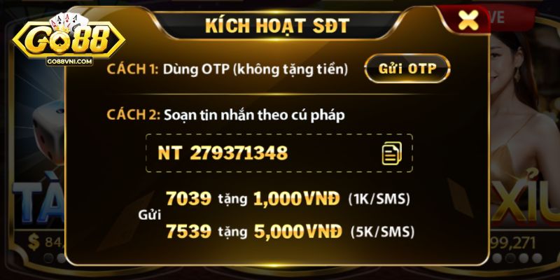 - Bước 2: Nhấn vào hãy kích hoạt số điện thoại => Bạn lựa chọn 1 trong 2 cách dùng mã OTP hoặc soạn tin theo cú pháp GB {Mã số hệ thống cung cấp} gửi 7039 hoặc 7539.