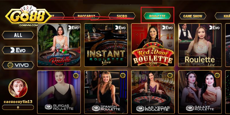 • Bước 3: Trên giao diện chính thức của cổng game vào danh mục Live => Chọn Live Casino => Vào nhà cung cấp Evo hoặc Vivo => Lựa chọn vào bàn Roulette => Chinh phục vòng quay để nhận thưởng giá trị.