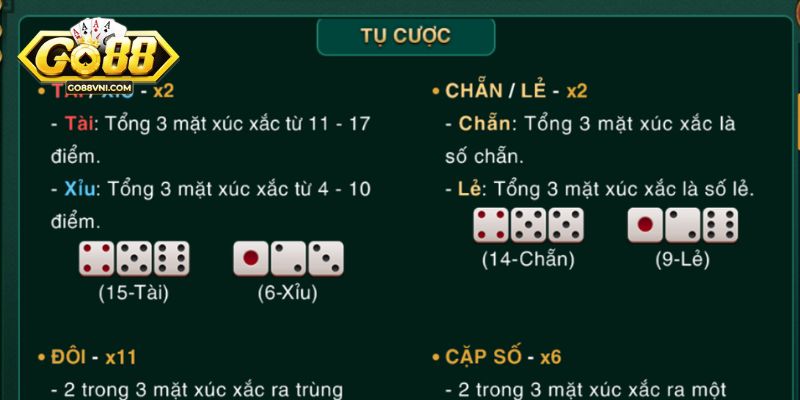- Ba viên xúc xắc có kết quả trùng nhau và trùng với con số người chơi đã lựa chọn.