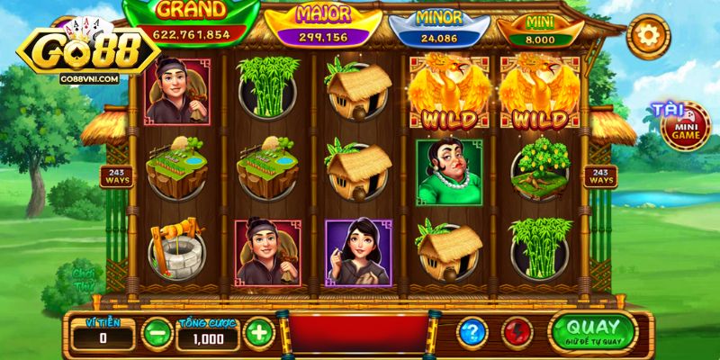 - Ăn Khế Trả Vàng: Trò chơi slots online Go88 này lấy cảm hứng từ câu chuyện cổ tích cùng tên của Việt Nam. Với những biểu tượng người anh người em lũy tre, cây khế, túi 3 gang, tiền vàng sẽ ẩn chứa đằng sau đó là hệ số nhân giá trị.