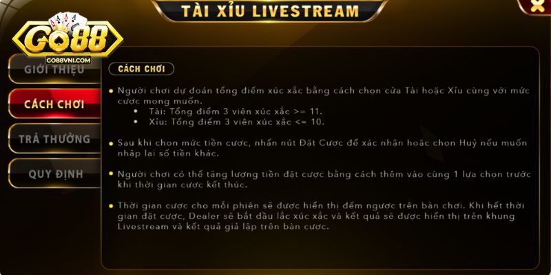 Tài Xỉu Go88 là một trò chơi livestream trực tiếp từ sòng bạc quốc tế. Người chơi sẽ theo dõi dealer người thật lắc xúc xắc và đưa ra dự đoán kết quả chính xác để nhận thưởng. Muốn hiểu rõ hơn, bạn hãy theo dõi nội dung cập nhật trong bài viết sau đây.
